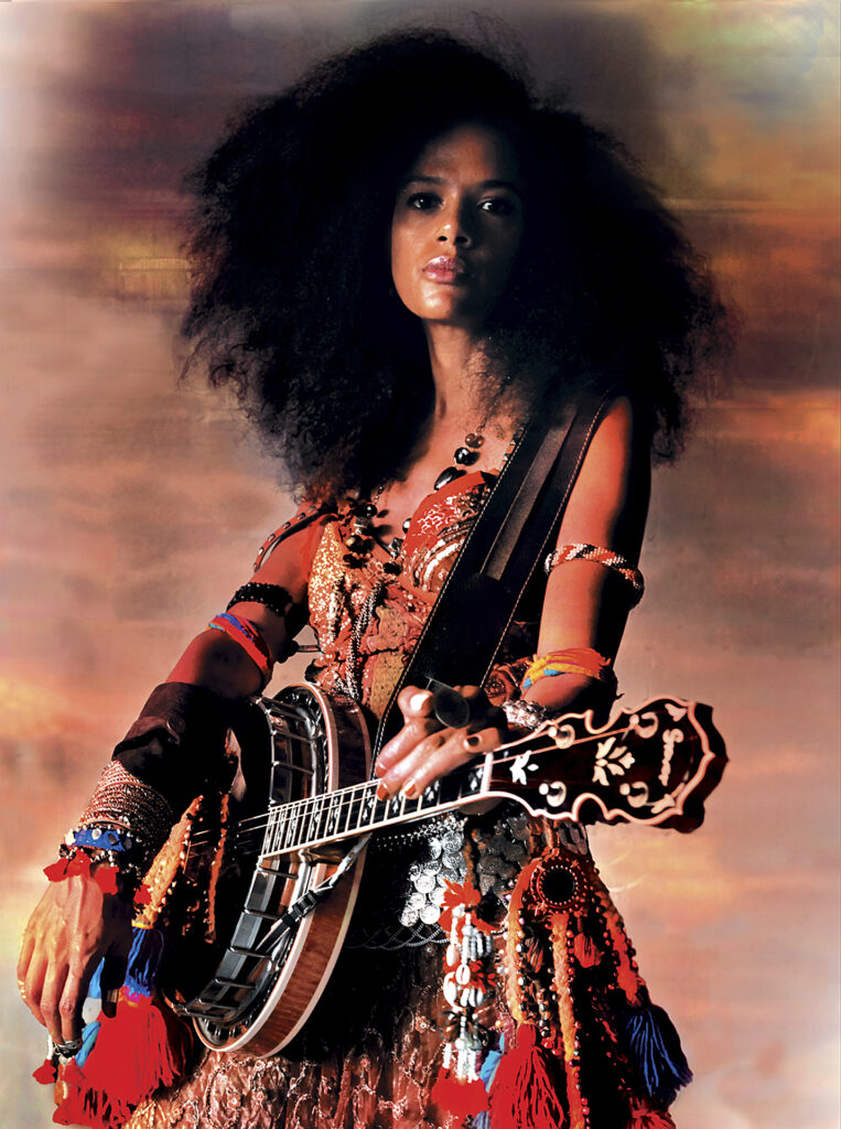 Mystical and warlike, she strums the banjo, alternating between hypnotic bottleneck slides and technoid beats.
